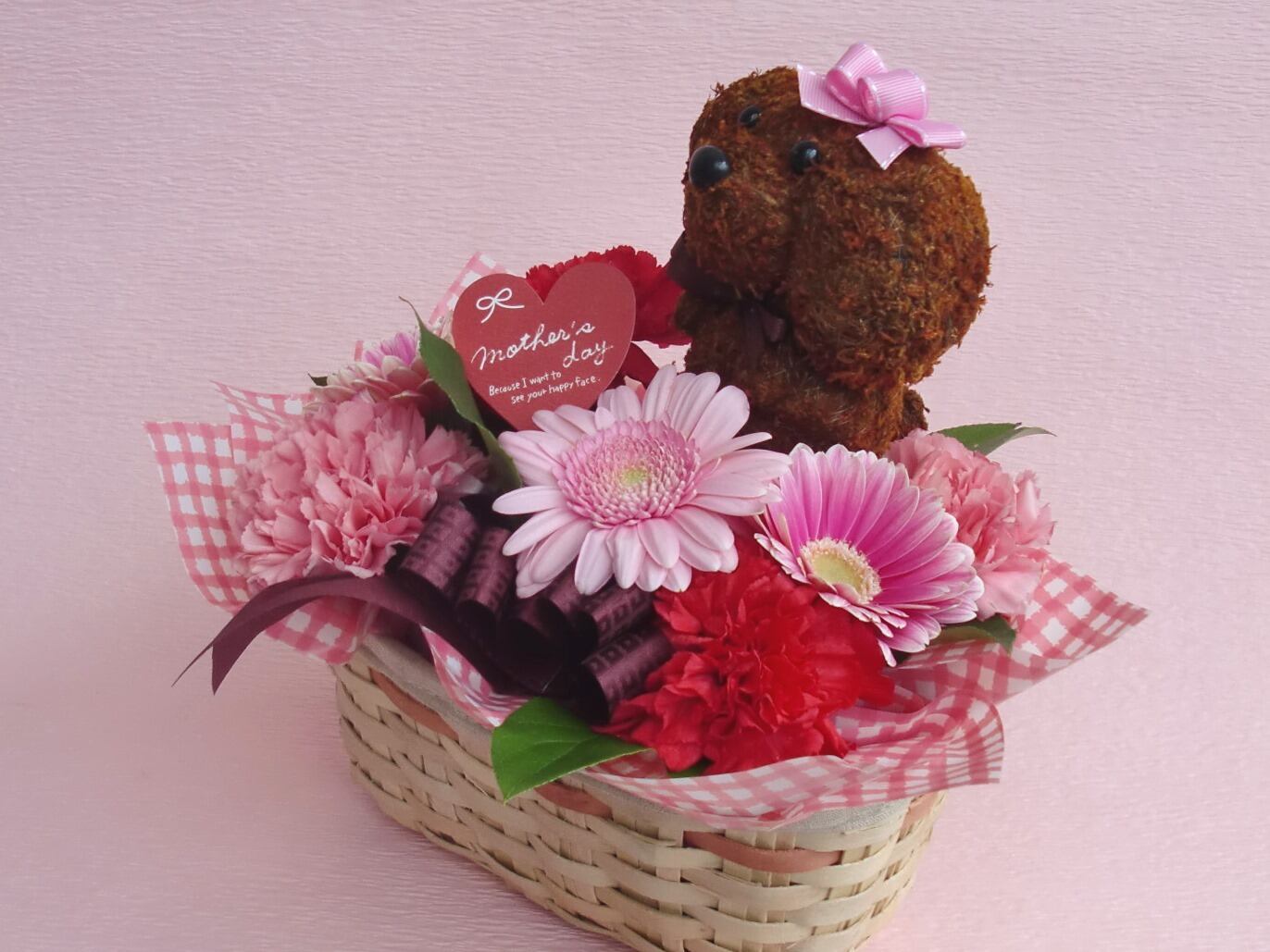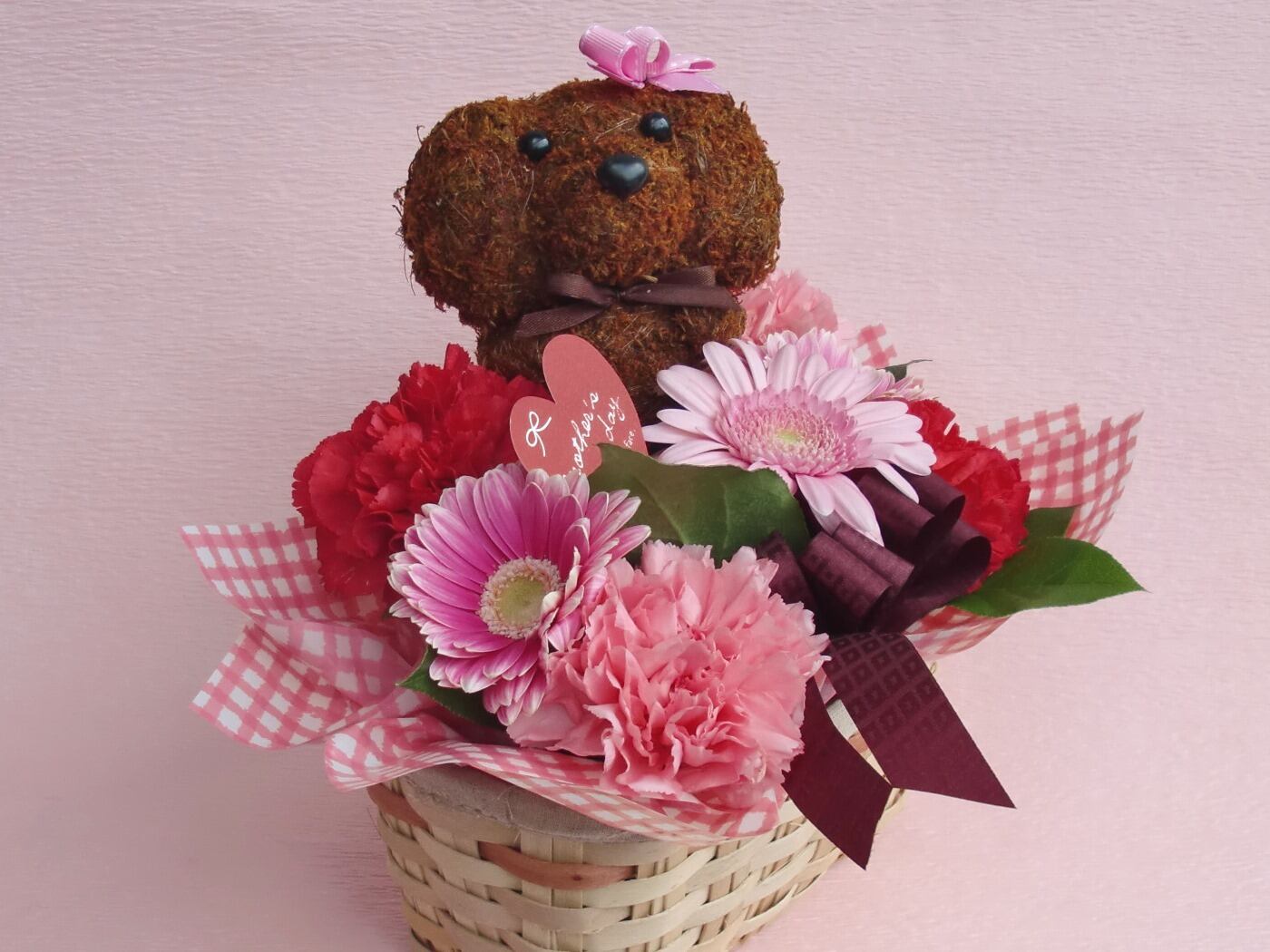 トイプードルのかわいいアレンジです。動物好きの方にお勧めです。ボリューム重視のため花材はこちらにお任せ下さい。メッセージプレート(その時のご用途に合わせてお選びいたします。)