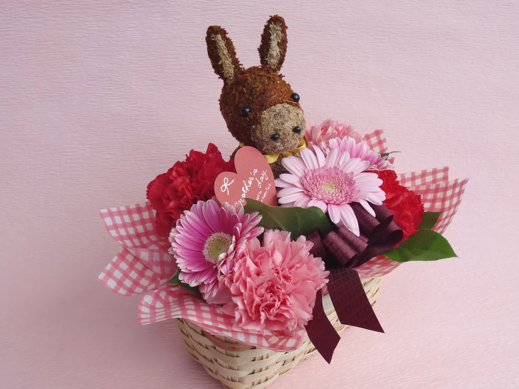 ロバさんのかわいいアレンジです。動物好きの方にお勧めです。ボリューム重視のため花材はこちらにお任せ下さい。プレートはその用途に合わせて変わります。