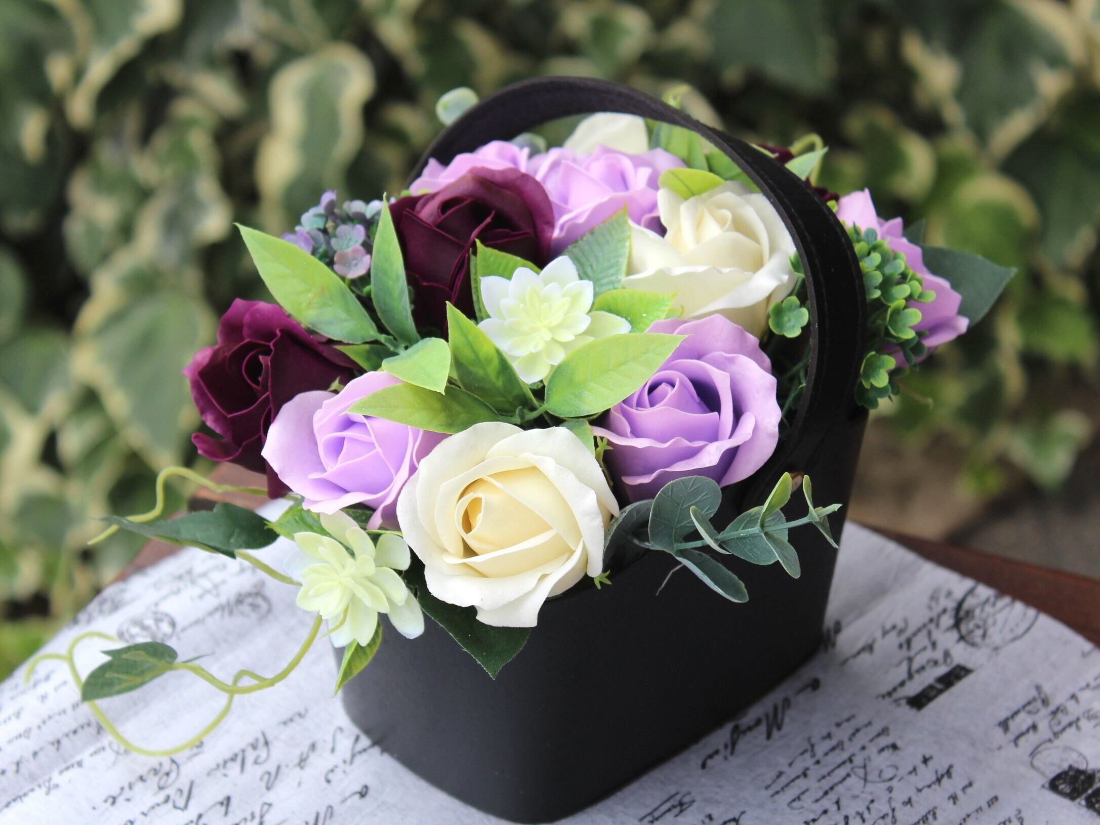 大人気のフレグランスフラワーにオシャレなレザー調のバスケットに入った新シリーズが登場です。 高級感のあるレザー調のブラックのバスケットの中にバラがいっぱい! ※シャボンフラワーとは、花びら一枚一枚が石鹸で出来ているお花です。優しいシャボンの香りと枯れることのない美しさを楽しむことができます。