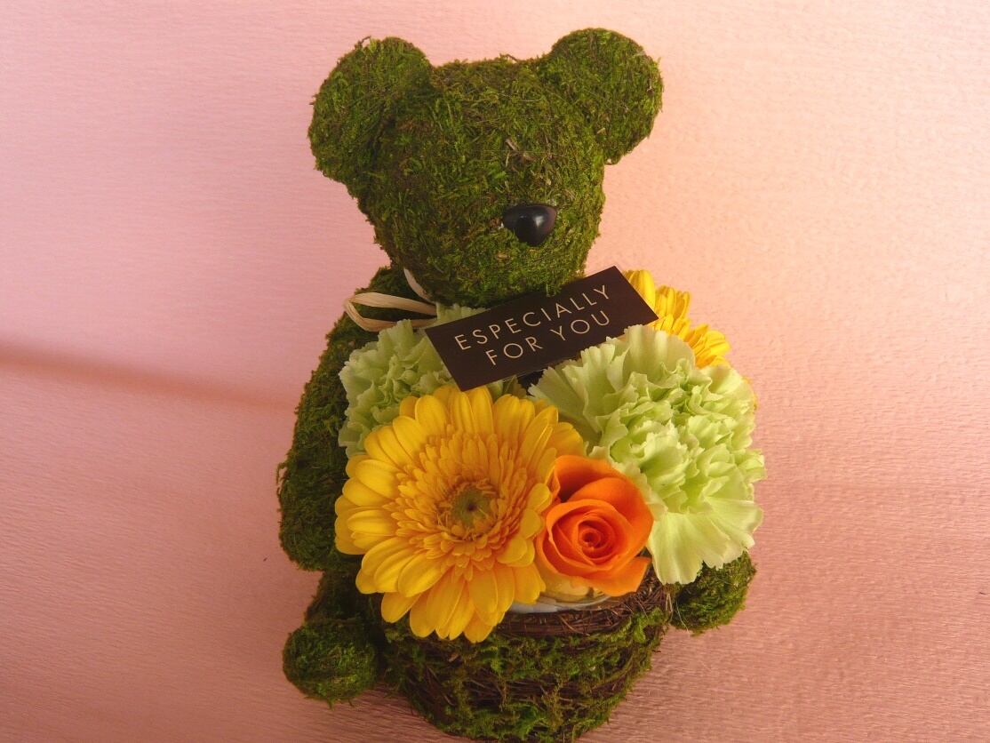 当店動物トピアリー部門 第1位のモスベアです。普通のアレンジよりキュートなかわいい物好きな人にピッタリな商品です。話題にのぼる商品なので相手への印象度はバッチリ!黄オレンジ系のお花をMIXして仕上げたアレンジメントです。ボリューム重視の為花材はお任せ下さい。